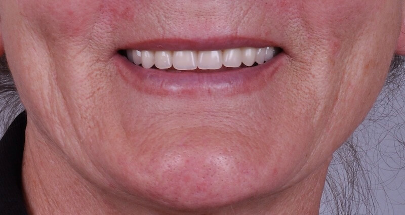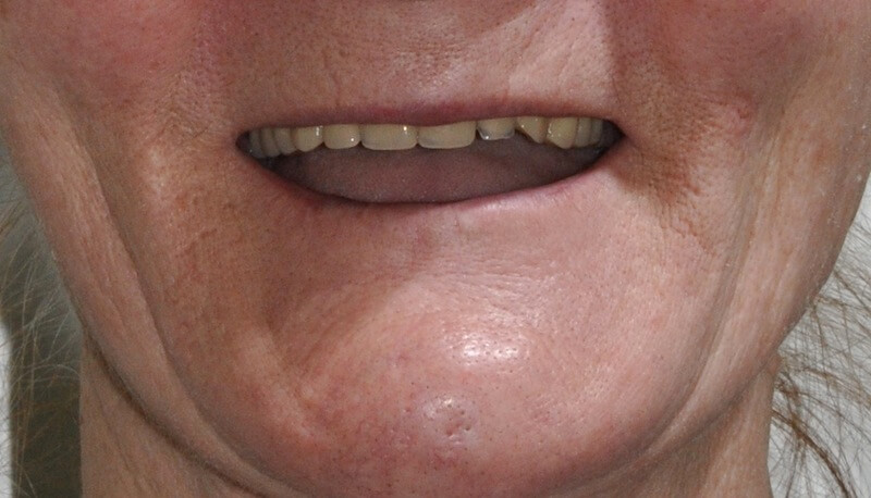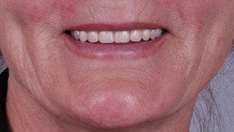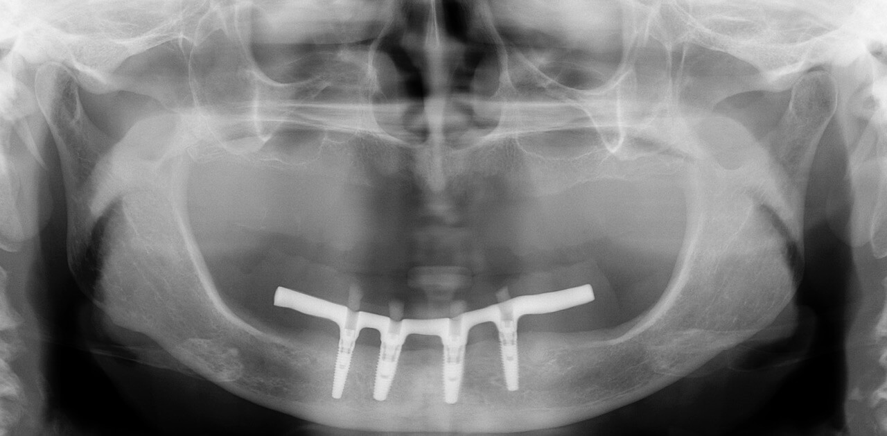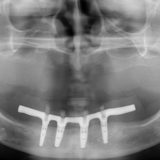 Обратилась с жалобами на отсутствие зубов. Было проведено лечение с установкой 4х имплантатов системы Нобель. Изготовлен условно съемный протез на винтовой фиксации на нижнюю челюсть и полный съемный протез на верхнюю челюсть.