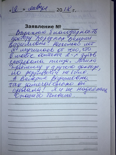 Спасибо огромное, Валерия Вадимовна! Вы самый лучший стоматолог, из всех которых я встречала!!! Единственный стоматолог в России, которому я доверяю! Очень честно лечит, спасла два зуба, потому что бережно сверлила (большинство стоматологов неаккуратно сверлят и пробивают до дентина, после чего зуб остаётся только убить - а мертвый он будет очень хрупкий)