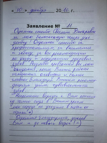 Хочу оставить отзыв о Валерие ! Замечательная девушка ,в первую очередь ,хоть с самого детства боюсь анестезию и ужасно её переношу ,она помогла справиться мне со страхом ,как минимум ,в то же время ,я ловлю себя на мысли ,что стала с удовольствием посещать клинику ,в которую хожу с детства )) Безумно рада ,что попала к ней на приём ,всегда буду лечиться у неё ,если будет потребность !) Как врач также безумно внимательна ,все делает действительно идеально ,ничего не болит и не ноют зубы даже после того,как отходит анестезия! Это все ,что хотела написать ) С Уважением ,Аревик .