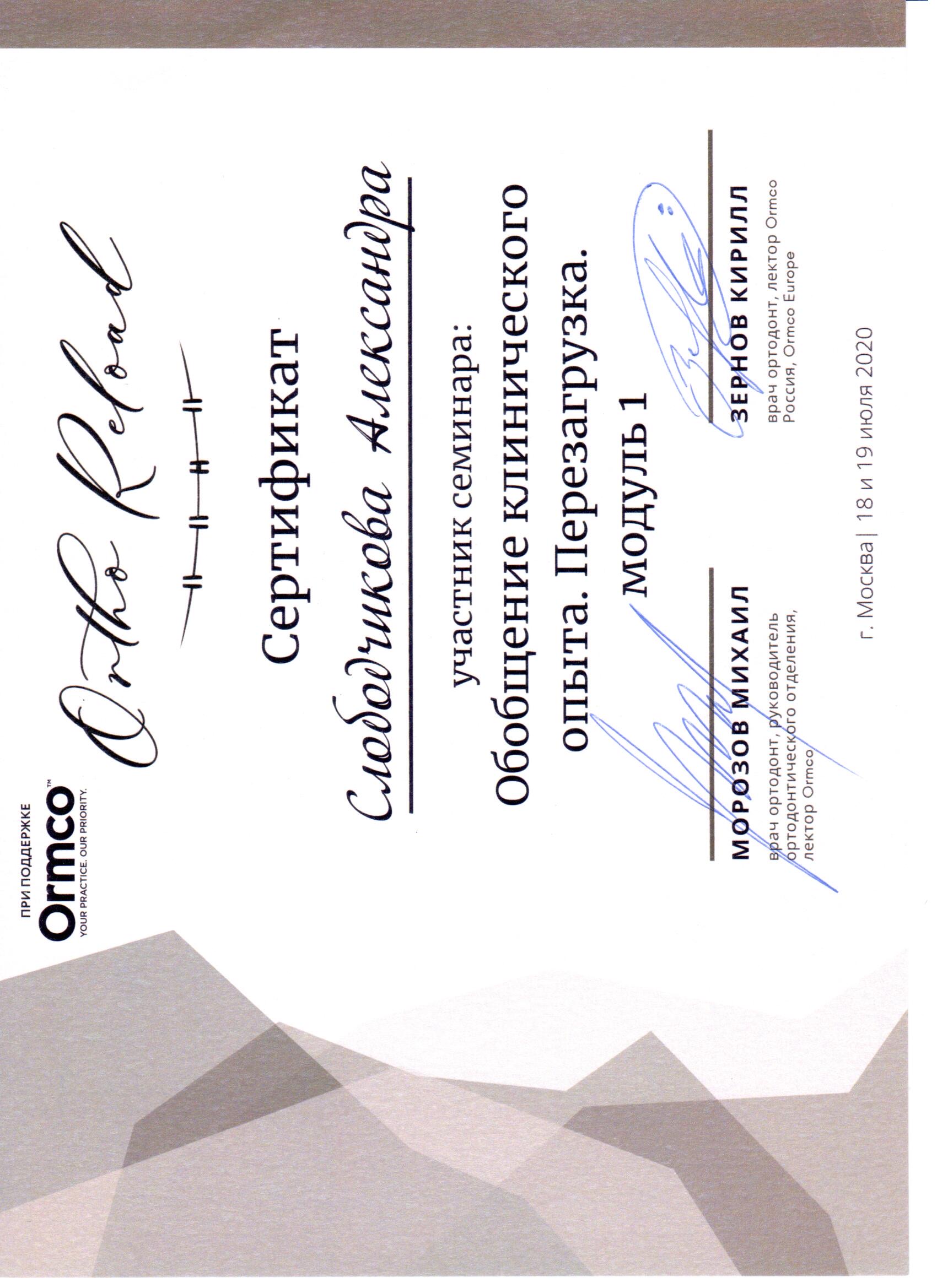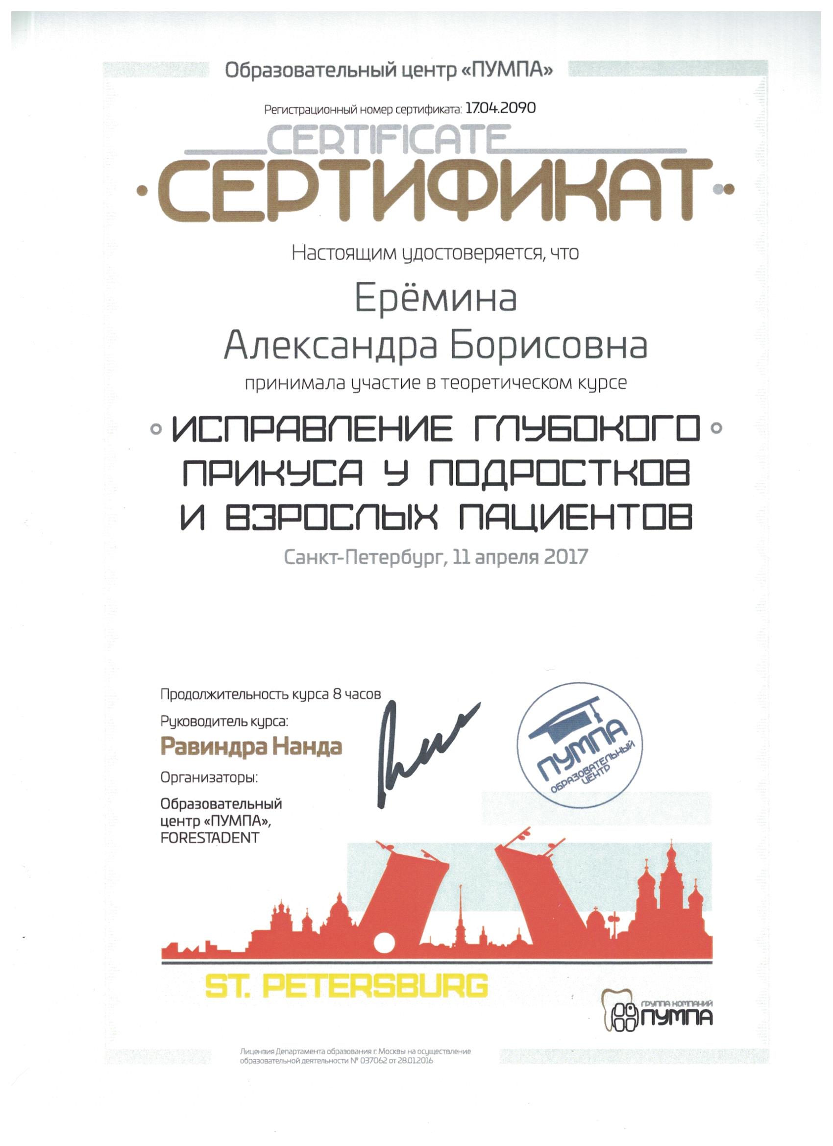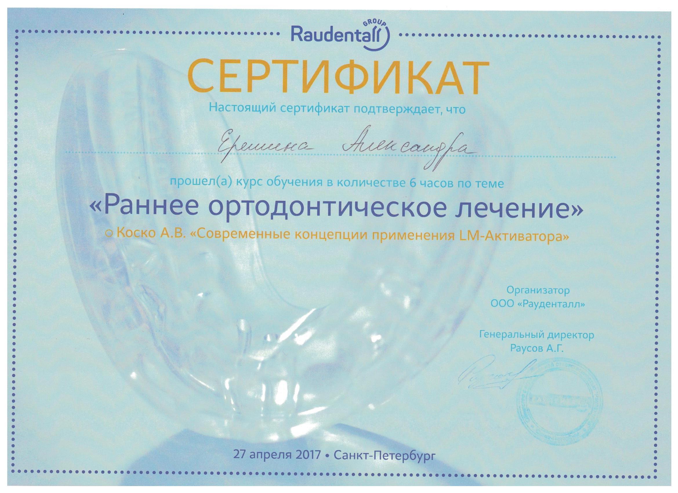 Прошла ординатуру в СЗГМУ им. Мечникова по специальности "Ортодонтия" в 2017 году.