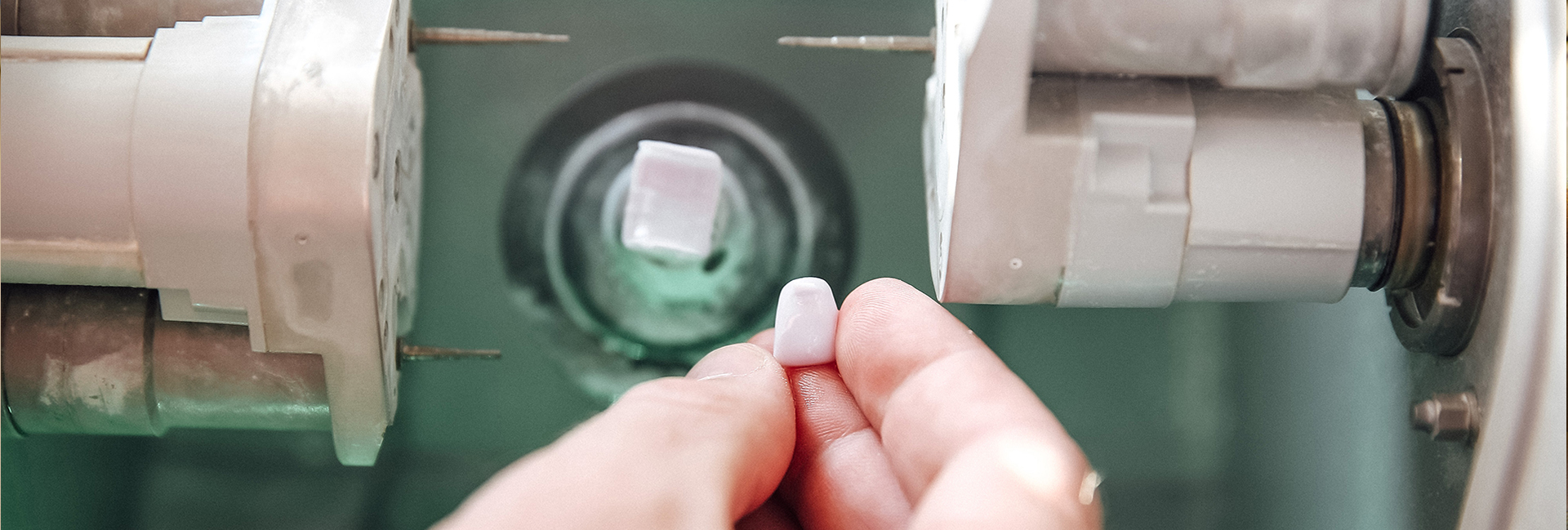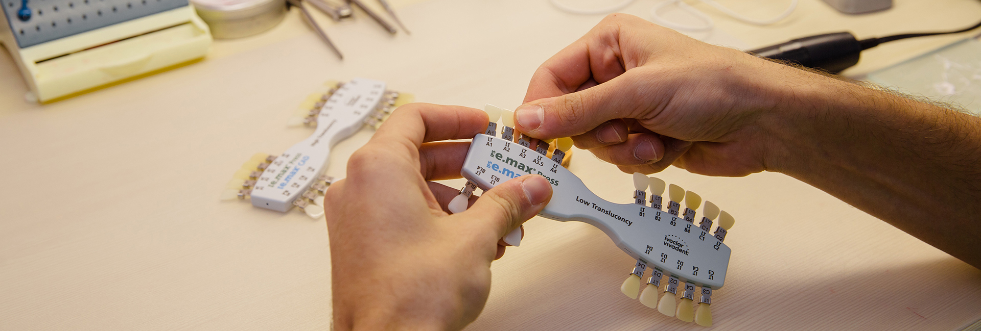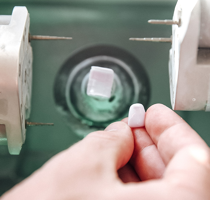 - Изготовление виниров. Этот процесс может происходить по двум технологиям: способом прессования и способом послойного нанесения и обжига, который позволяет получить максимально точный цвет, даёт более прочный материал, который крепче на краях и реже образует сколы. Виниры из фарфора изготавливаются после компьютерного моделирования на особом фрезеровочном станке.